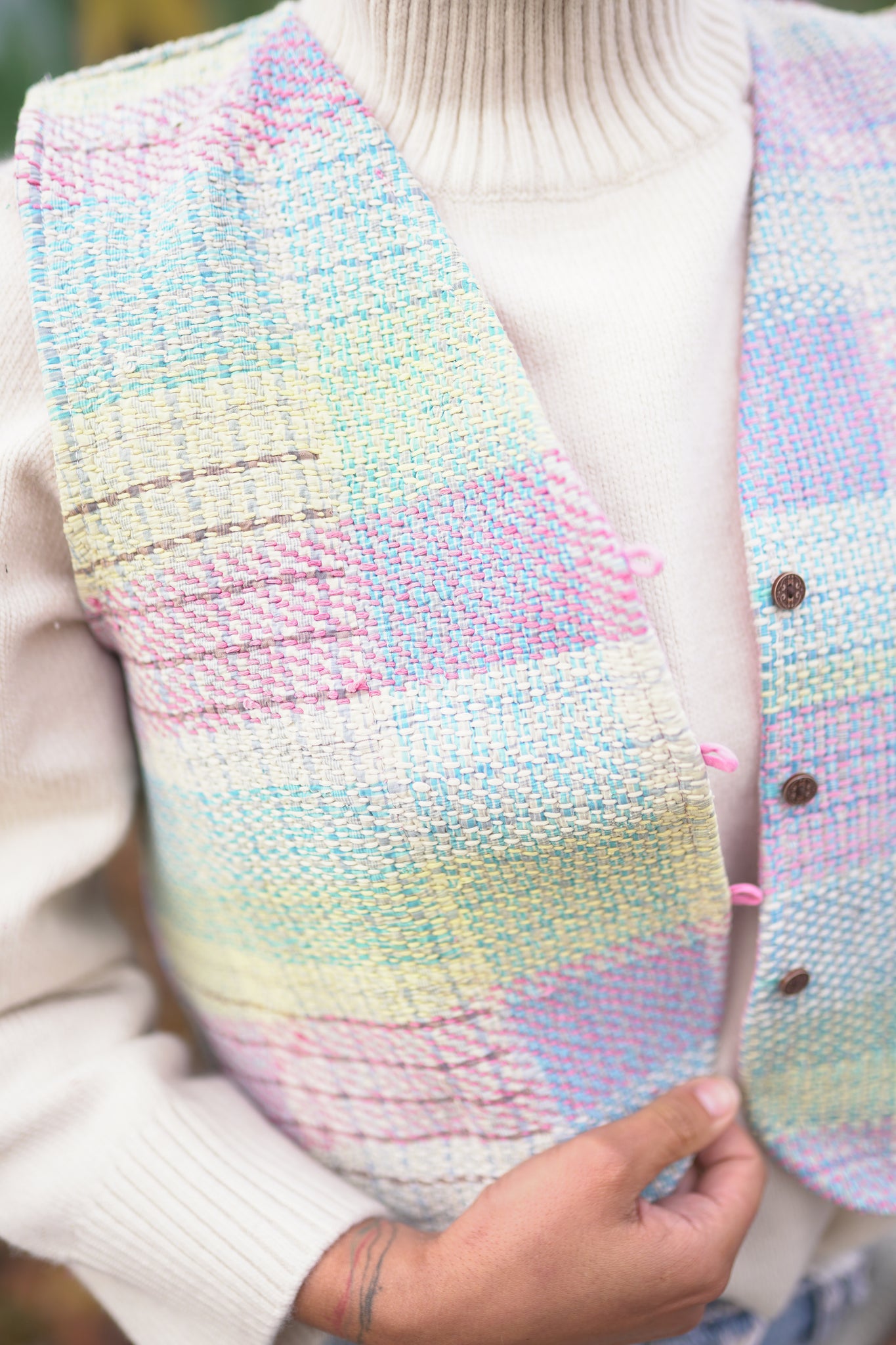 Naprosto nadčasová oversized láska na první pohled. Vesta je oboustranná, a tak si můžeš měnit vzhled dle nálady. Vyrobena z upcyklované vintage kanthy, která je stará až 100 let a každý steh je šitý ručně. K zapínání slouží roztomilé knoflíčky.