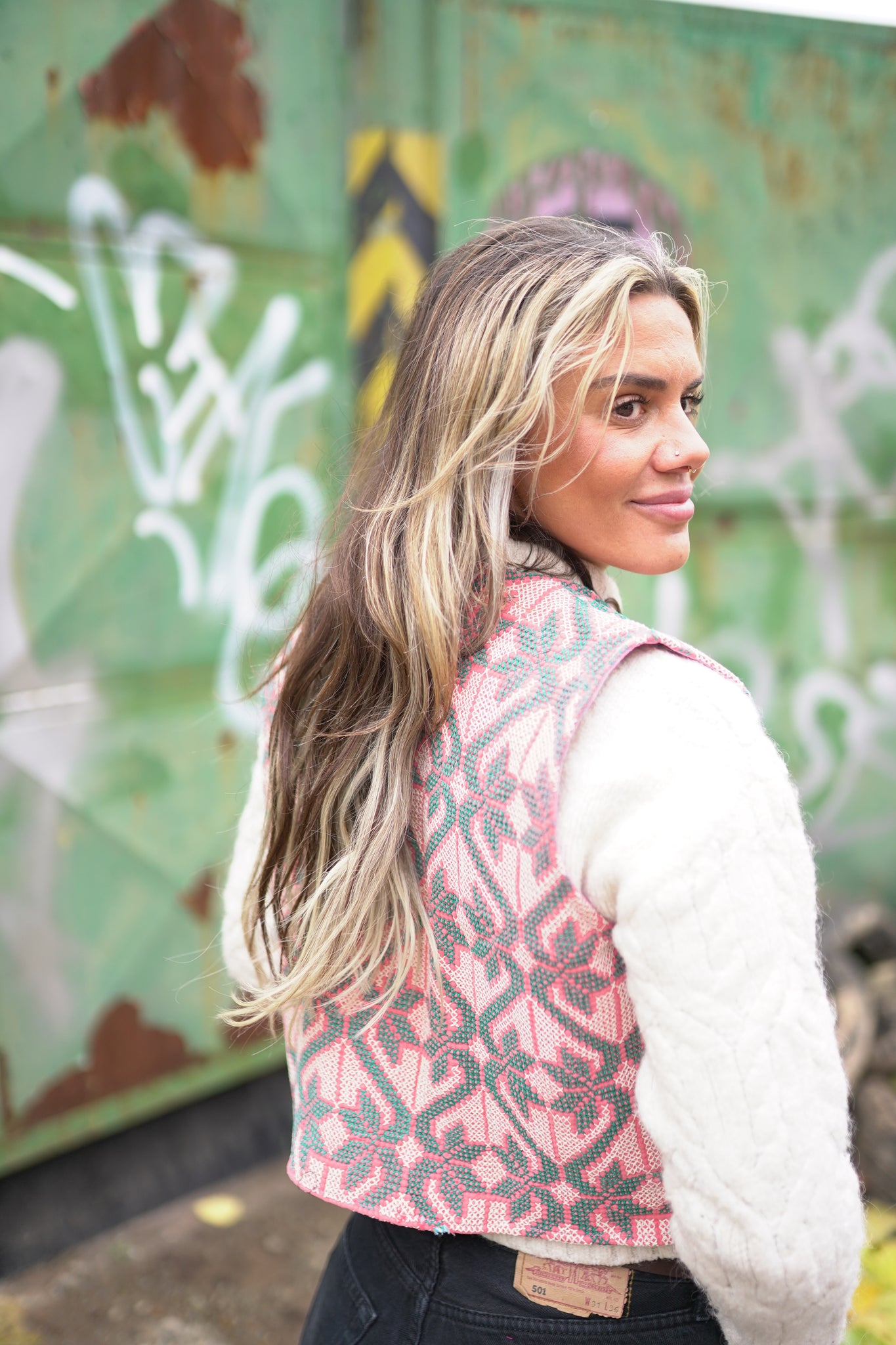 Naprosto nadčasová oversized láska na první pohled. Vesta je oboustranná, a tak si můžeš měnit vzhled dle nálady. Vyrobena z upcyklované vintage kanthy, která je stará až 100 let a každý steh je šitý ručně. K zapínání slouží roztomilé knoflíčky.