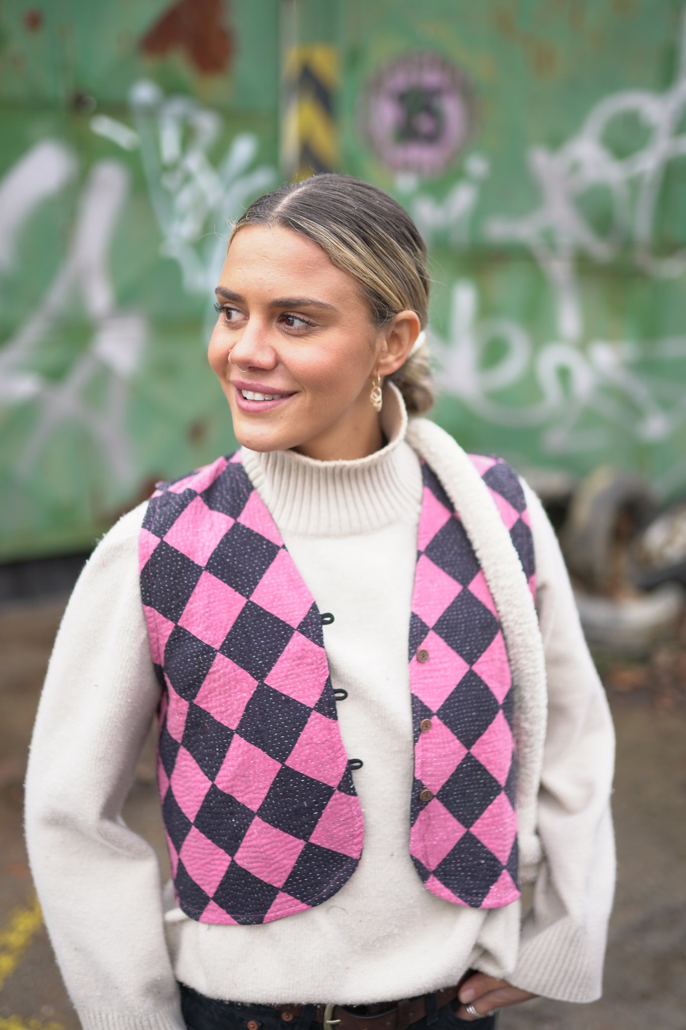 Naprosto nadčasová oversized láska na první pohled. Vesta je oboustranná, a tak si můžeš měnit vzhled dle nálady. Vyrobena z upcyklované vintage kanthy, která je stará až 100 let a každý steh je šitý ručně. K zapínání slouží roztomilé knoflíčky.