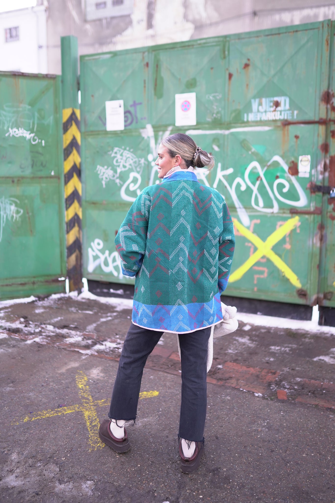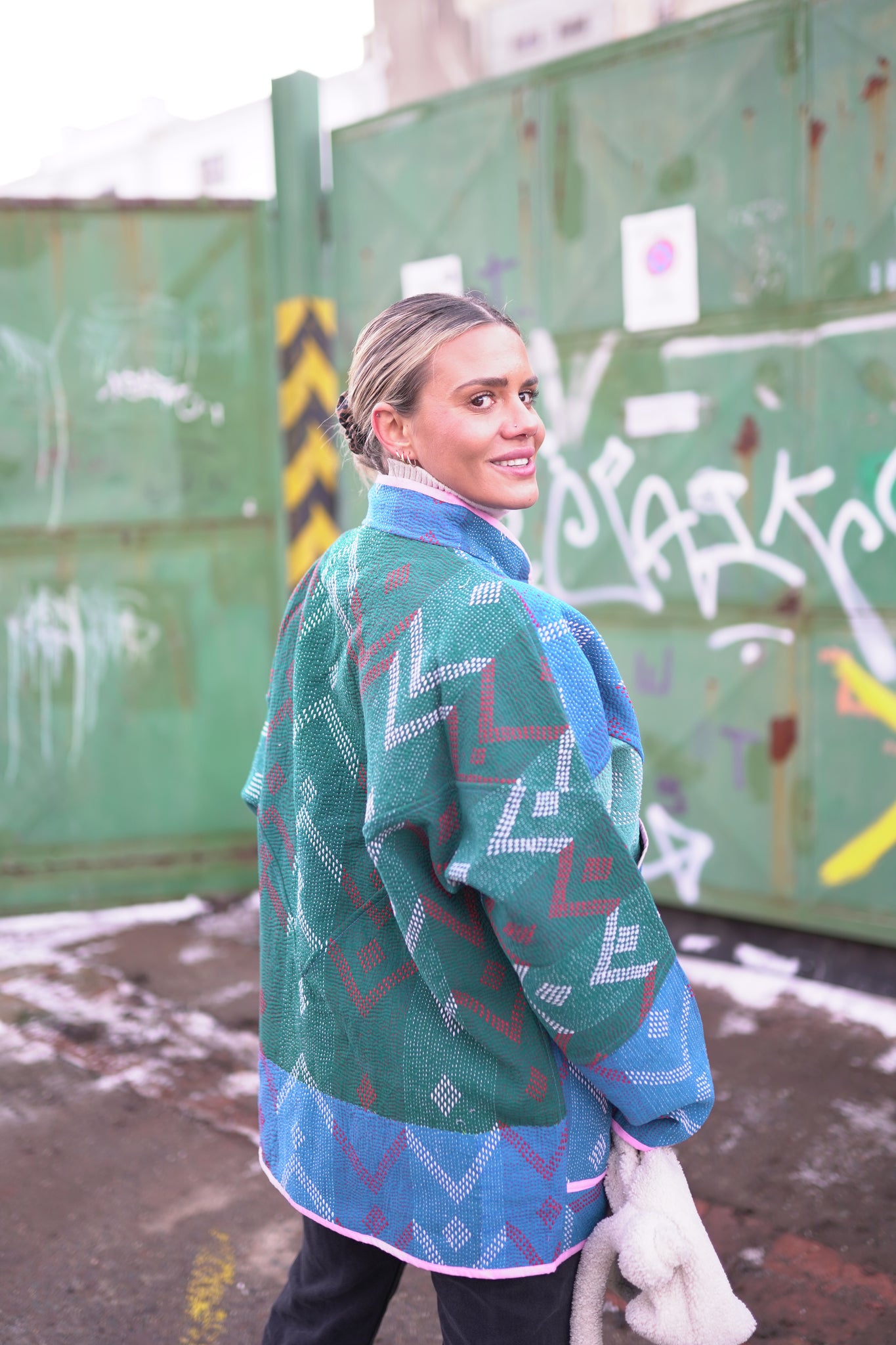 Absolut zeitlose, übergroße Liebe auf den ersten Blick. Die Jacke ist wendbar , sodass Sie den Look je nach Lust und Laune verändern können. Hergestellt aus bis zu 100 Jahre altem Upcycling-Vintage-Kantha und jeder Stich ist von Hand genäht. Absolut einzigartig, aus jedem einzelnen Kantha wurde nur 1 Jacke hergestellt. Sie können 100 % sicher sein, dass Sie niemanden mit der gleichen Jacke treffen werden. Seien Sie originell :-)