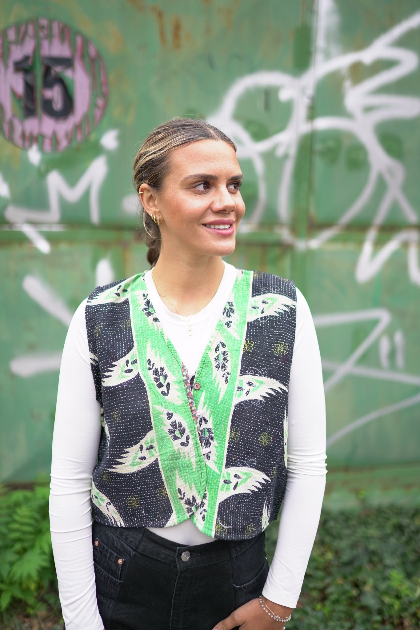 Absolut zeitlose, übergroße Liebe auf den ersten Blick. Die Weste ist wendbar , sodass Sie den Look je nach Stimmung ändern können. Hergestellt aus bis zu 100 Jahre altem Upcycling-Kantha, jeder Stich ist von Hand genäht . Zur Befestigung dienen hübsche Knöpfe.