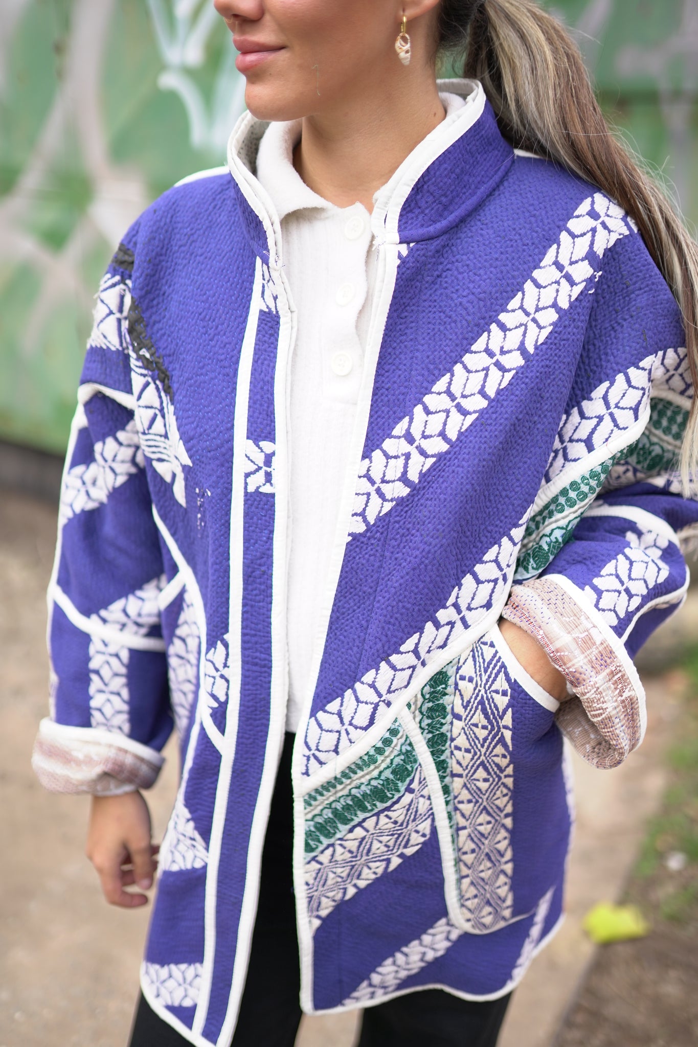 Absolutely timeless oversized love at first sight. The jacket is reversible , so you can change the look according to your mood. Made from upcycled vintage kantha, which is up to 100 years old and every stitch is sewn by hand. Absolutely unique, only 1 jacket was made from each unique kantha. You can be 100% sure that you will not meet anyone in the same jacket. Be original :-)